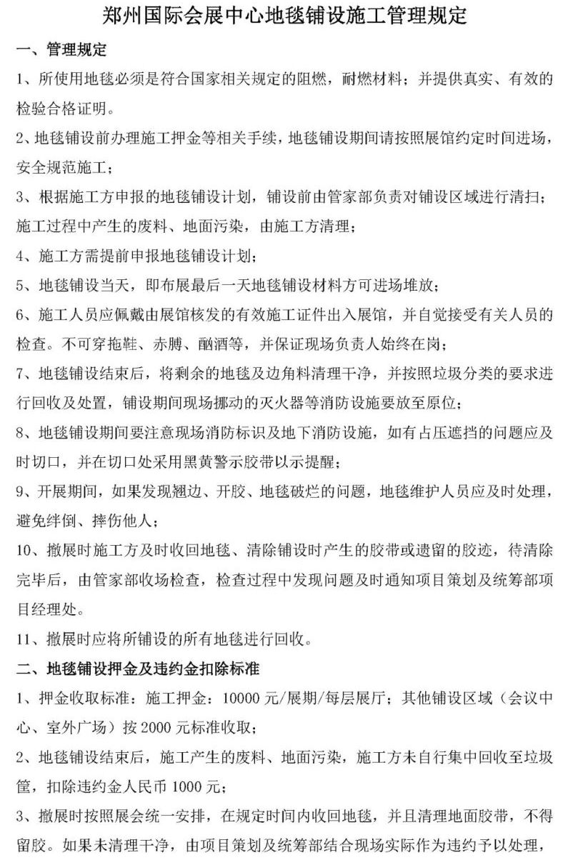 首頁服務(wù)指南下載中心文章詳情 文章詳情 地毯鋪設(shè)施工管理規(guī)定 鄭州國際會展中心地毯鋪設(shè)施工管理規(guī)定 《鄭州國際會展中心地毯鋪設(shè)施工管理規(guī)定》文檔下載