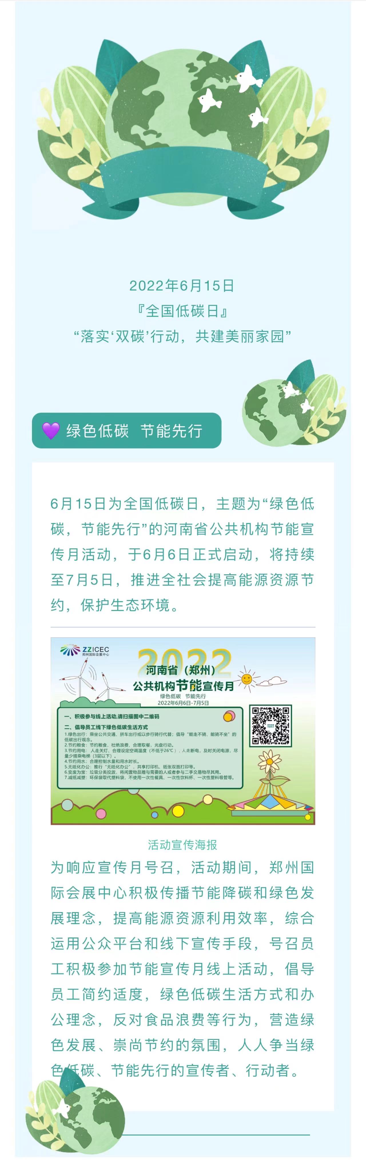 6月15日為全國(guó)低碳日,主題為“綠色低碳,節(jié)能先行”的河南省公共機(jī)構(gòu)節(jié)能宣傳月活動(dòng),于6月6日正式啟動(dòng),將持續(xù)至7月5日。為響應(yīng)宣傳月號(hào)召,活動(dòng)期間,鄭州國(guó)際會(huì)展中心積極傳播節(jié)能降碳和綠色發(fā)展理念,提高能源資源利用效率,綜合運(yùn)用公眾平臺(tái)線和線下宣傳手段,號(hào)召員工積極參加節(jié)能宣傳月線上活動(dòng),倡導(dǎo)員工簡(jiǎn)約適度,綠色低碳生活方式和辦公理念,反對(duì)食品浪費(fèi)等內(nèi)容,營(yíng)造綠色發(fā)展、崇尚節(jié)約的氛圍,人人爭(zhēng)當(dāng)綠色低碳、節(jié)能先行的宣傳者、行動(dòng)者、引領(lǐng)者。