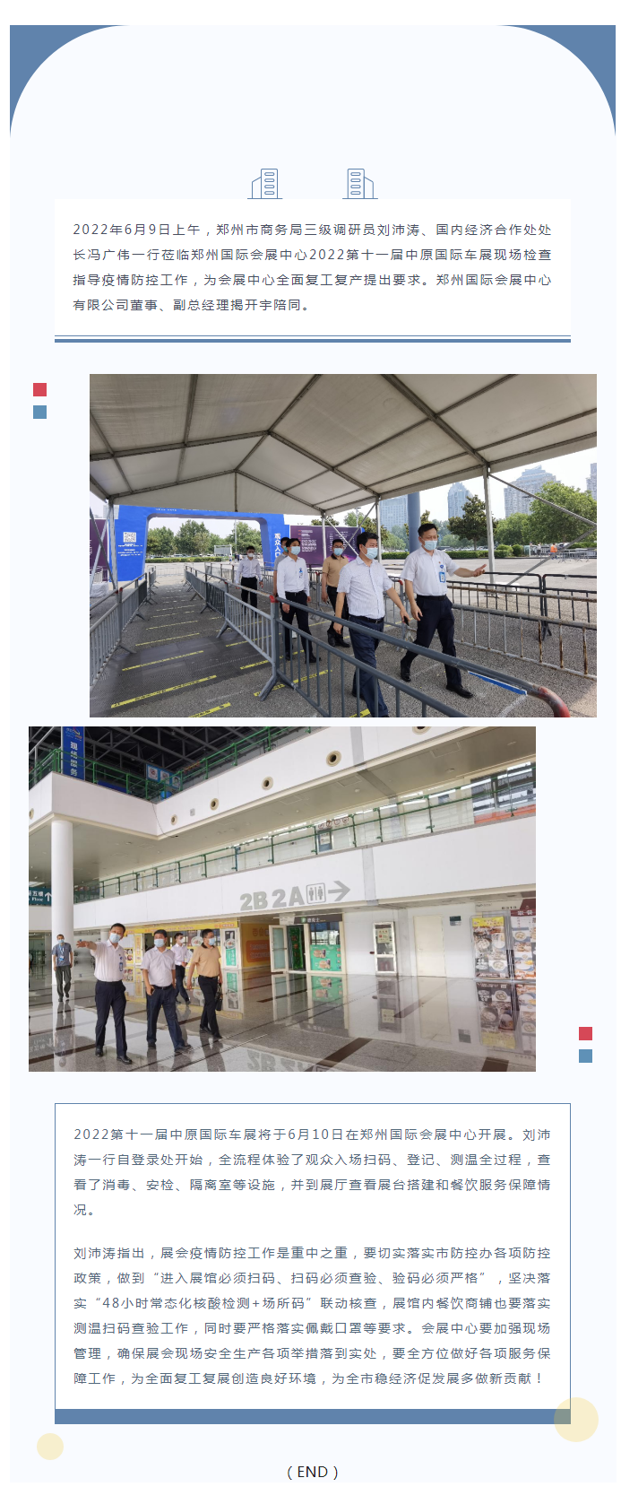 2022年6月9日上午,鄭州市商務(wù)局三級(jí)調(diào)研員劉沛濤、國(guó)內(nèi)經(jīng)濟(jì)合作處處長(zhǎng)馮廣偉一行蒞臨鄭州國(guó)際會(huì)展中心2022第十一屆中原國(guó)際車展現(xiàn)場(chǎng)檢查指導(dǎo)疫情防控工作,為會(huì)展中心全面復(fù)工復(fù)產(chǎn)提出要求。鄭州國(guó)際會(huì)展中心有限公司董事、副總經(jīng)理揭開宇陪同。