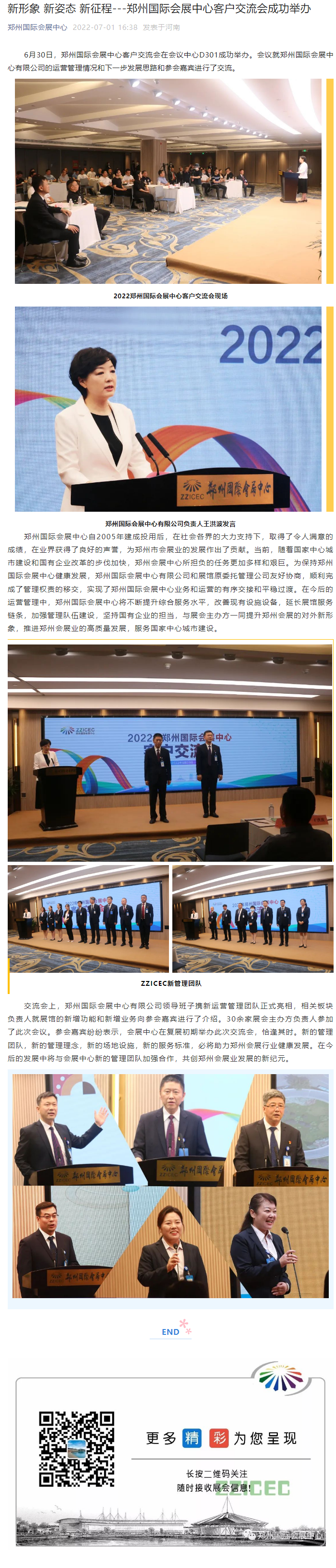 首頁(yè)新聞中心展會(huì)新聞文章詳情 文章詳情 新形象 新姿態(tài) 新征程---鄭州國(guó)際會(huì)展中心客戶交流會(huì)成功舉辦 6月30日,鄭州國(guó)際會(huì)展中心客戶交流會(huì)在會(huì)議中心D301成功舉辦。會(huì)議就鄭州國(guó)際會(huì)展中心有限公司的運(yùn)營(yíng)管理情況和下一步發(fā)展思路和參會(huì)嘉賓進(jìn)行了交流。