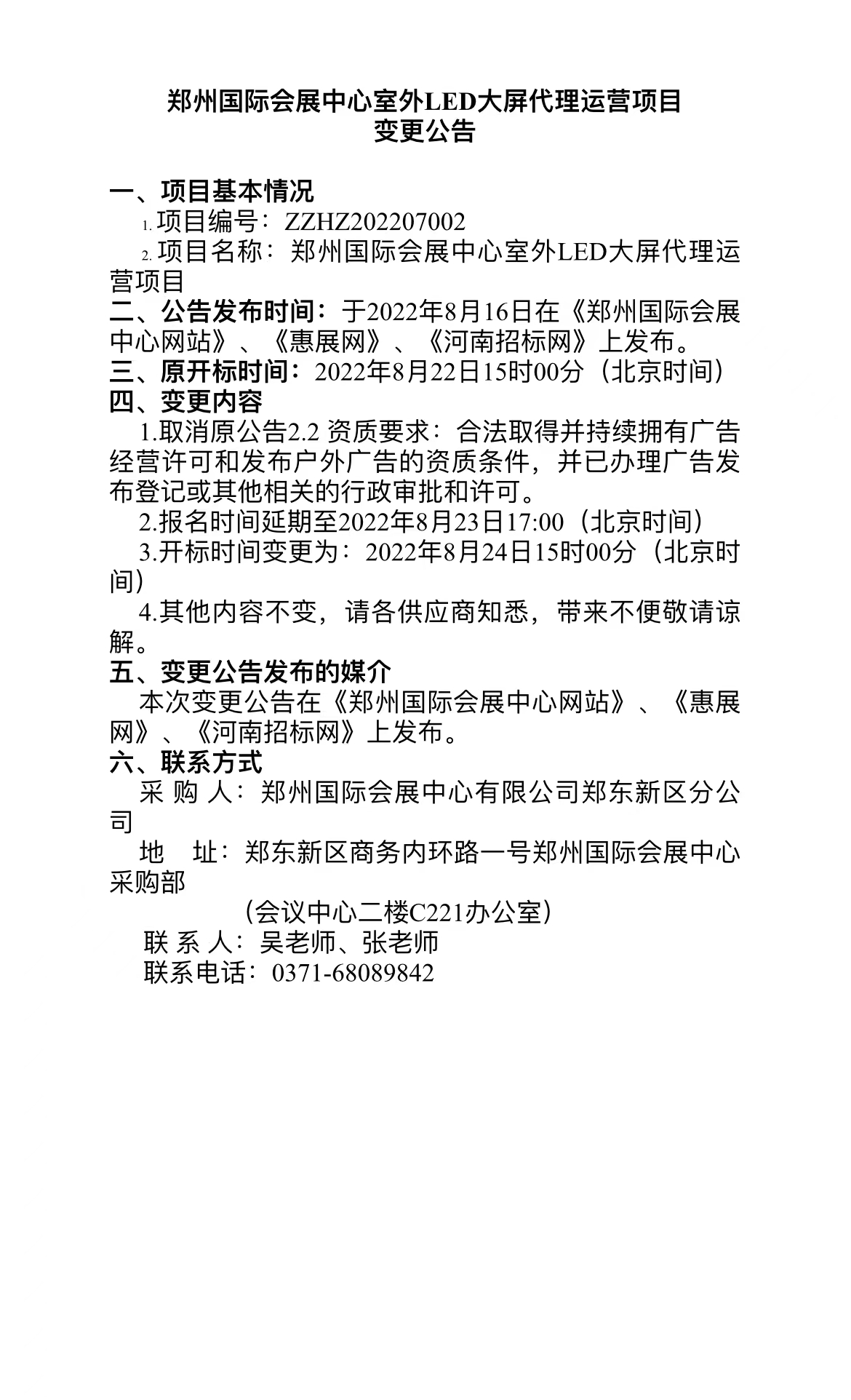 鄭州國(guó)際會(huì)展中心室外LED大屏代理運(yùn)營(yíng)項(xiàng)目 變更公告