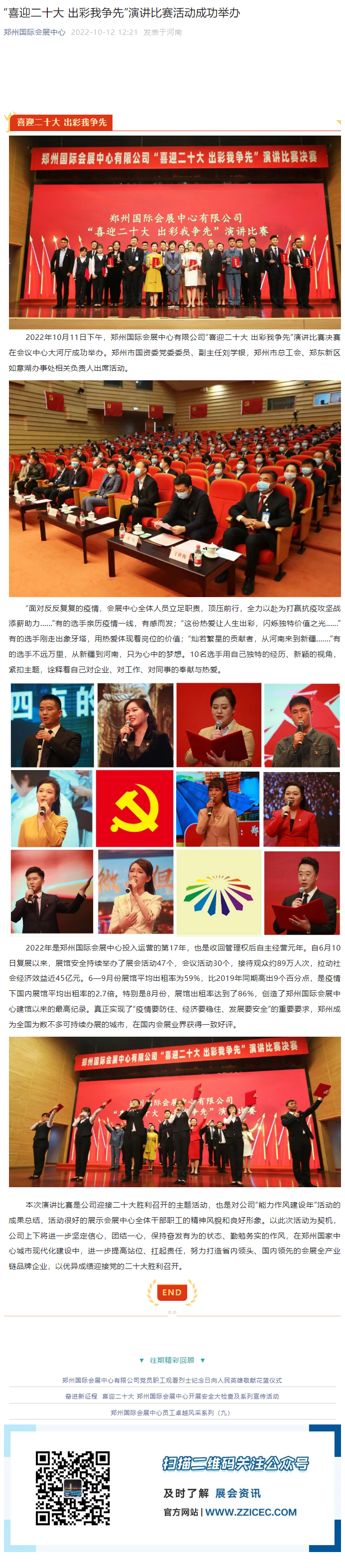 首頁新聞中心展會新聞文章詳情 文章詳情 “喜迎二十大 出彩我爭先”演講比賽活動成功舉辦 2022年10月11日下午,鄭州國際會展中心有限公司“喜迎二十大 出彩我爭先”演講比賽決賽在會議中心大河廳成功舉辦。鄭州市國資委黨委委員、副主任劉學(xué)銀,鄭州市總工會、鄭東新區(qū)如意湖辦事處相關(guān)負責(zé)人出席活動。