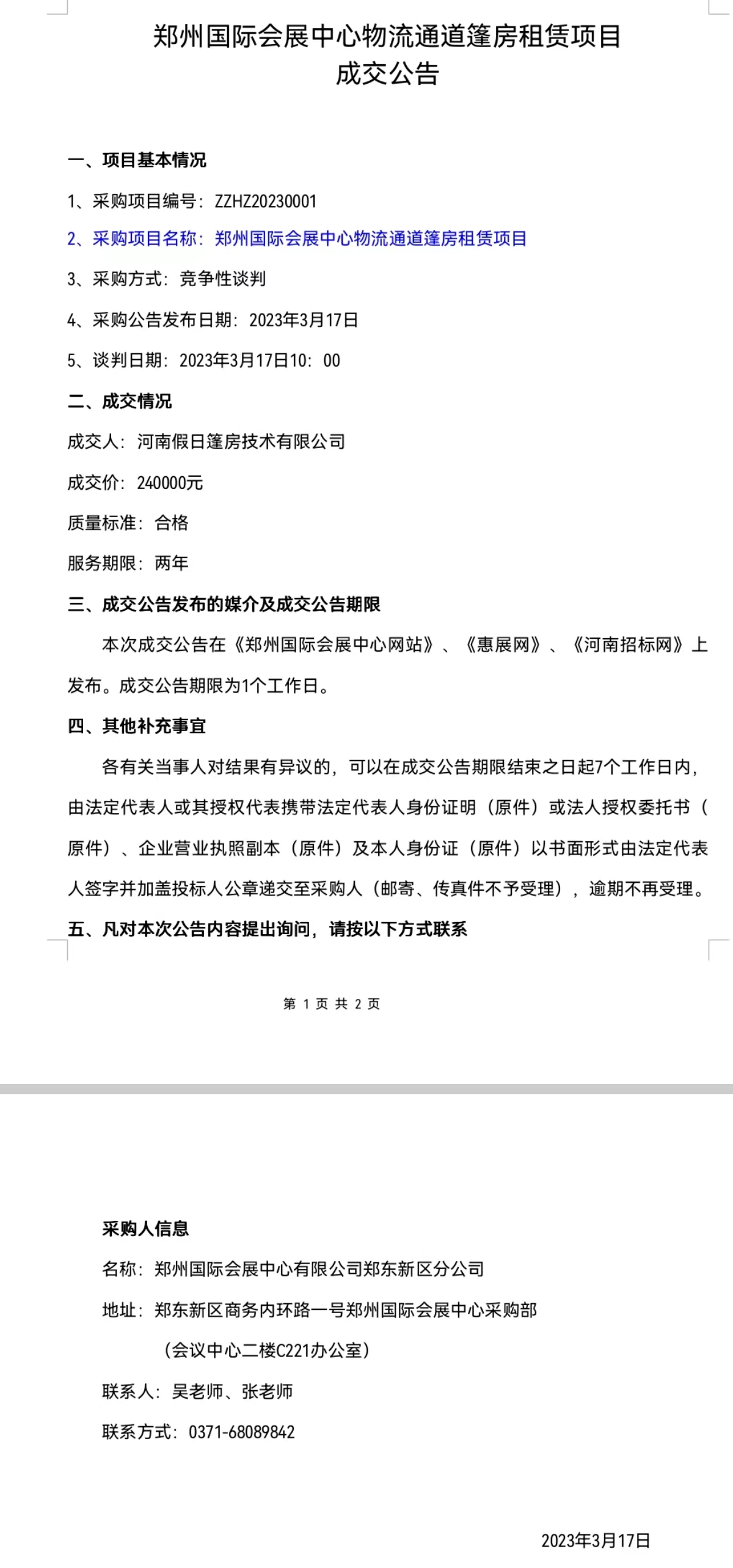 鄭州國(guó)際會(huì)展中心物流通道篷房租賃項(xiàng)目 成交公告