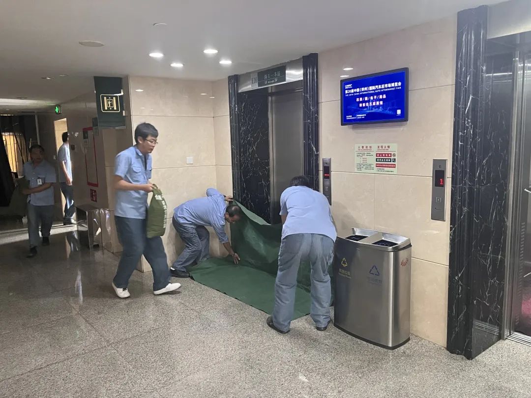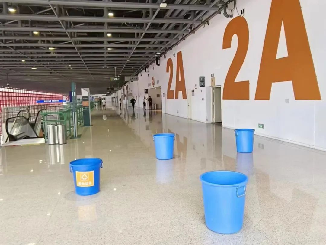 氣象局發(fā)布暴雨黃色預(yù)警,公司啟動Ⅲ級黃色應(yīng)急響應(yīng),各部門按照預(yù)案進行沙袋擺放,會議中心和展覽中心滴漏點用防汛桶接水,地面水漬安排保潔人員清理。