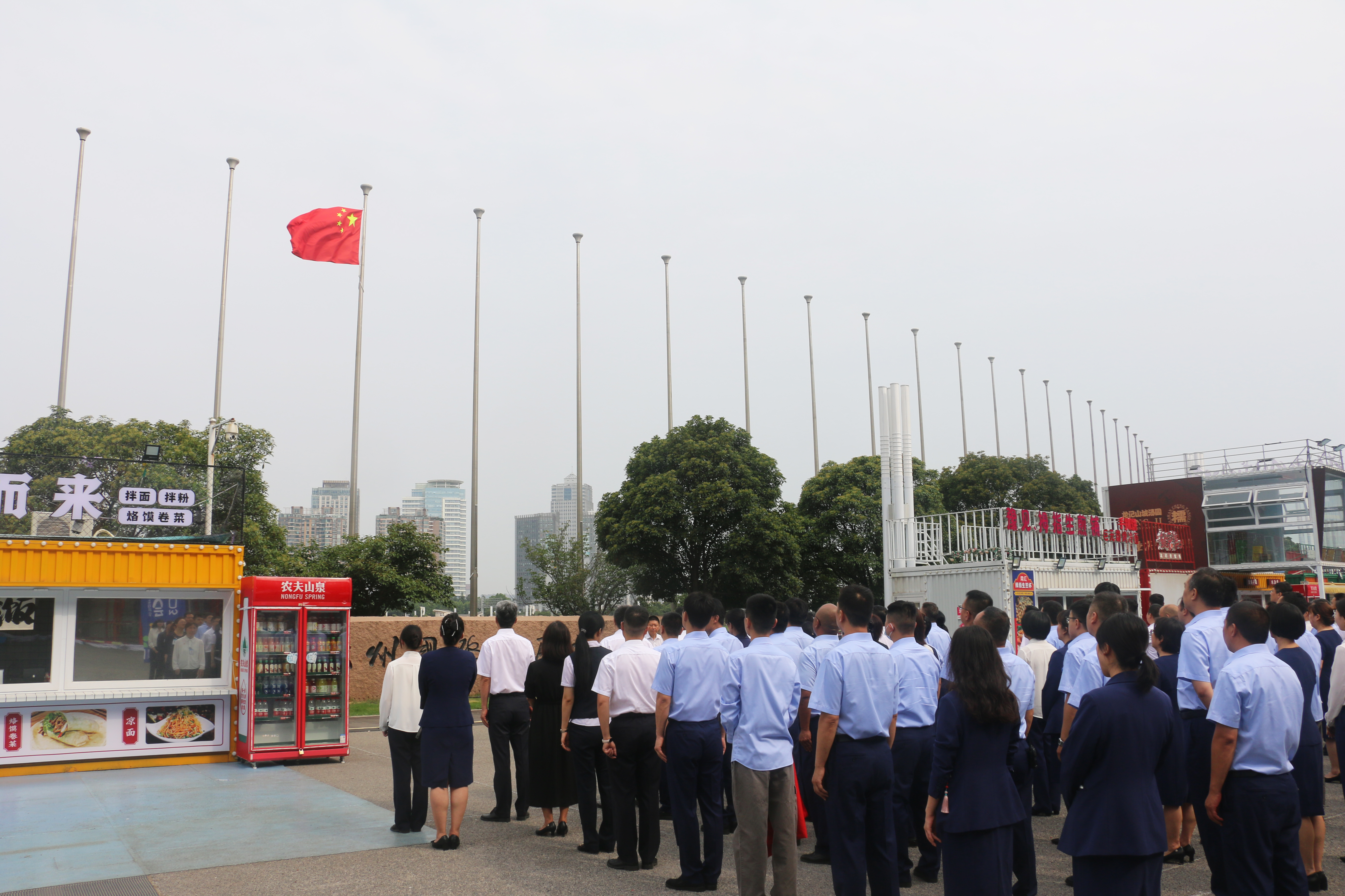 在會展中心全體員工期盼與注視下,五星紅旗伴隨著國歌冉冉升起。